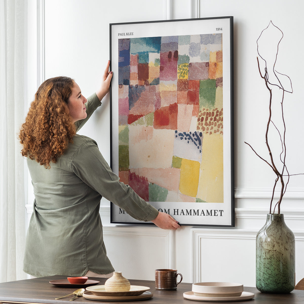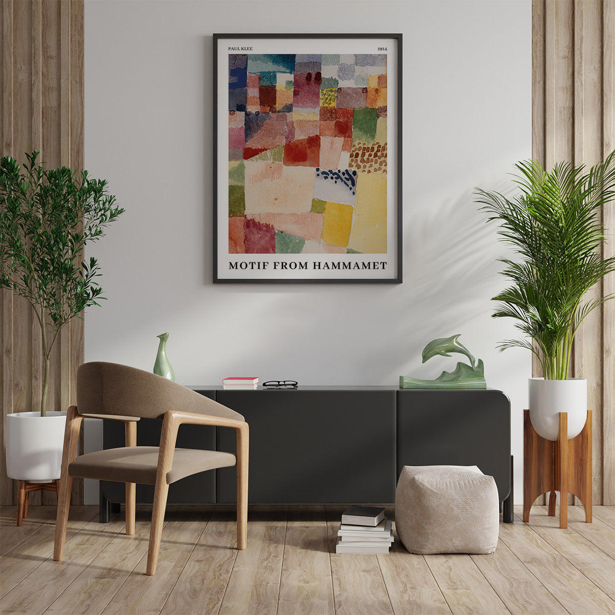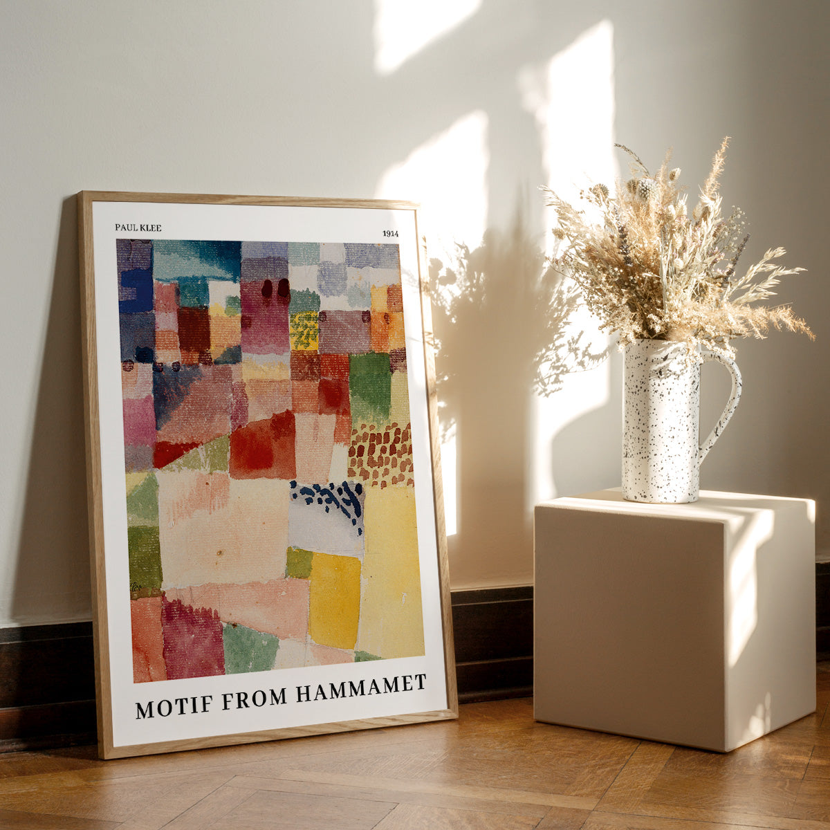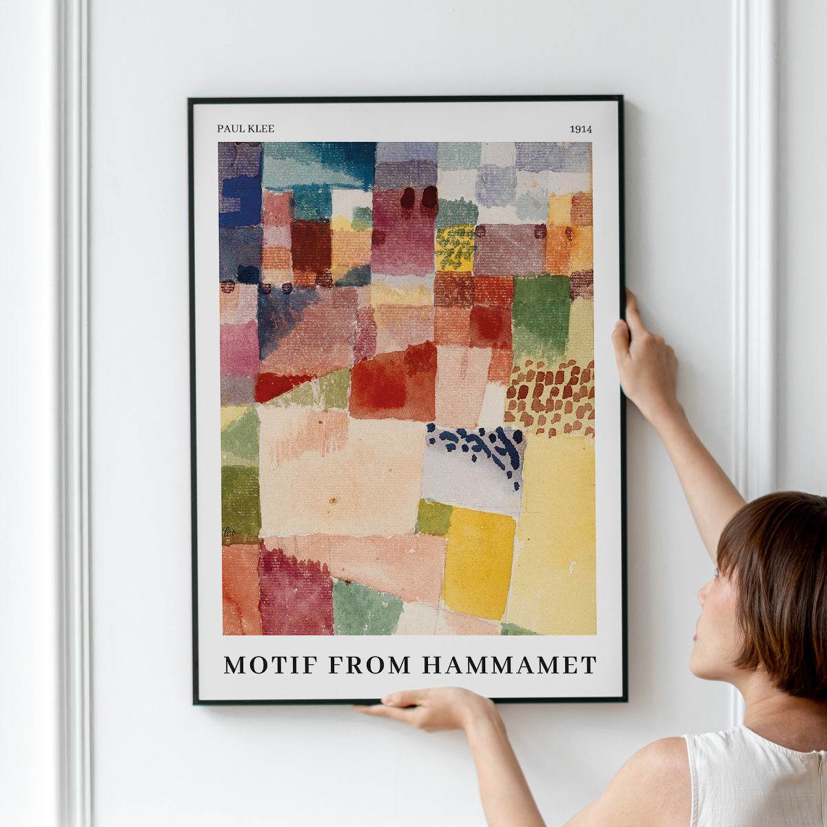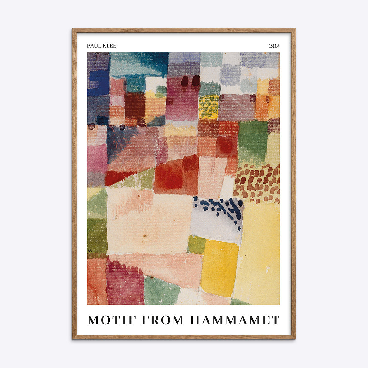Motivet til plakaten "Paul Klee Motif from Hammamet" var oprindeligt malet af den tysk-schweiziske kunstner Paul Klee. Klee arbejdede med kunst hele livet. Lige fra hans spæde studiestart i München 1898 til senere at blive lærer på Düsseldorf kunstakademi i 1940. Paul Klee døde i 1940, men hans farverige motiver lever videre i bedste velgående, bl.a. her hos Poster Society, hvor du kan bl.a. kan købe kunstplakaten "Paul Klee Motif from Hammamet".