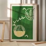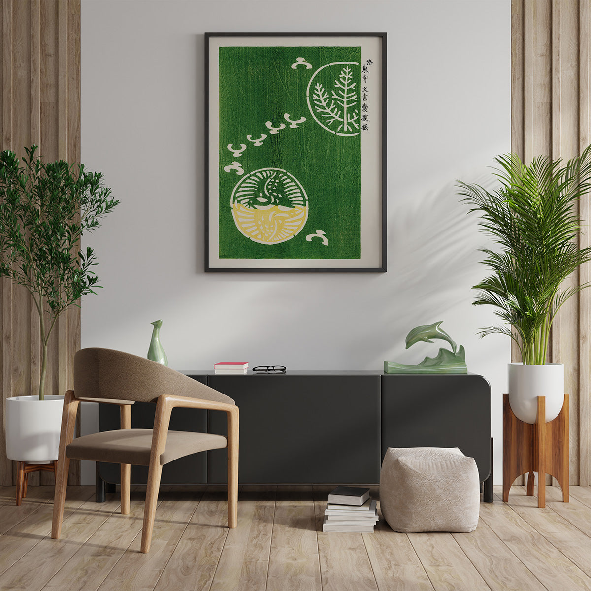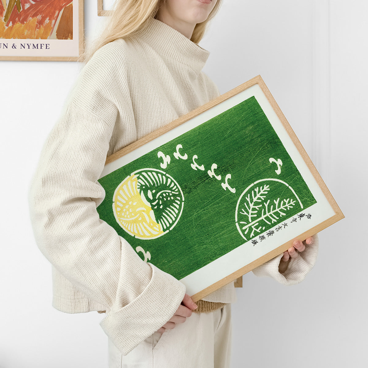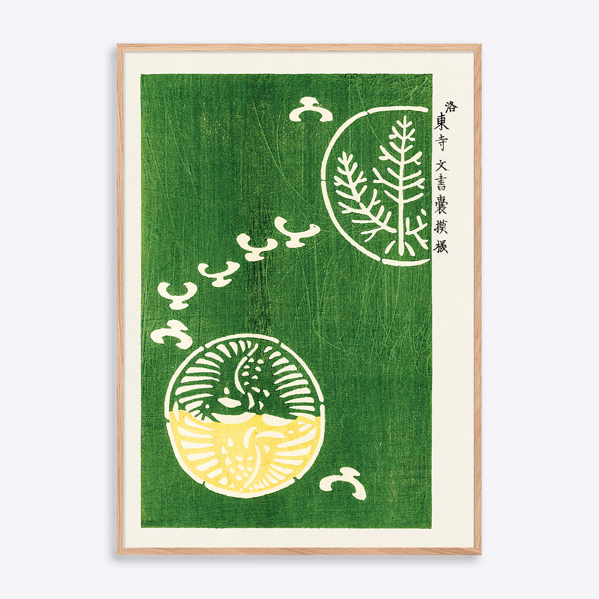 Det grønne motiv fra Yatsuo no tsubaki Woodblock Grøn hylder det simple, skønne og elegante ved teknikken. Japansk skønhed, der vil pynte i ethvert hjem. Et perfekt match med vores egetræsrammer. Hvis du kan lide 'Træsnit Grøn', så se også vores plakat "Swans" eller "Seagulls" i samme japanske stil.