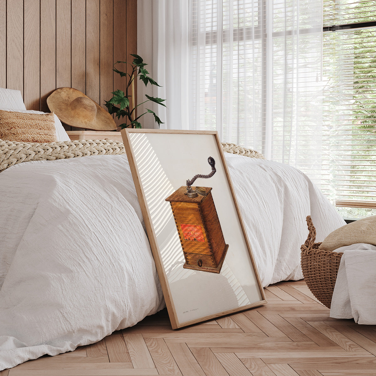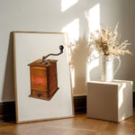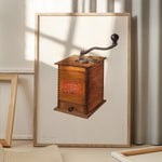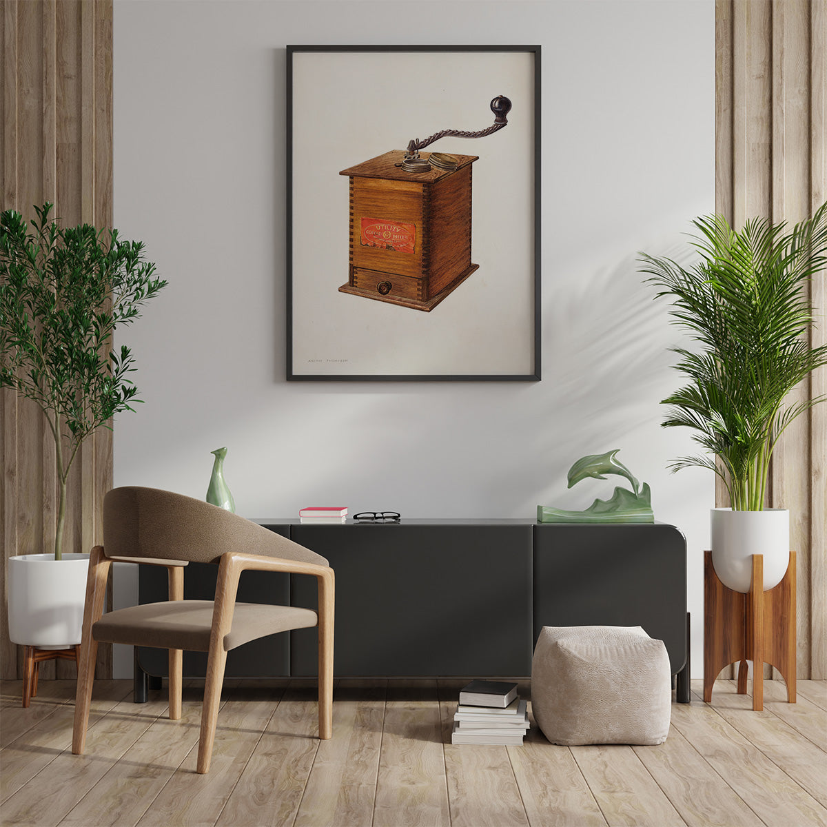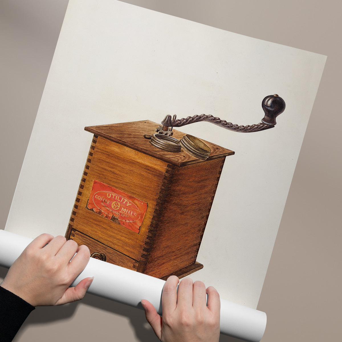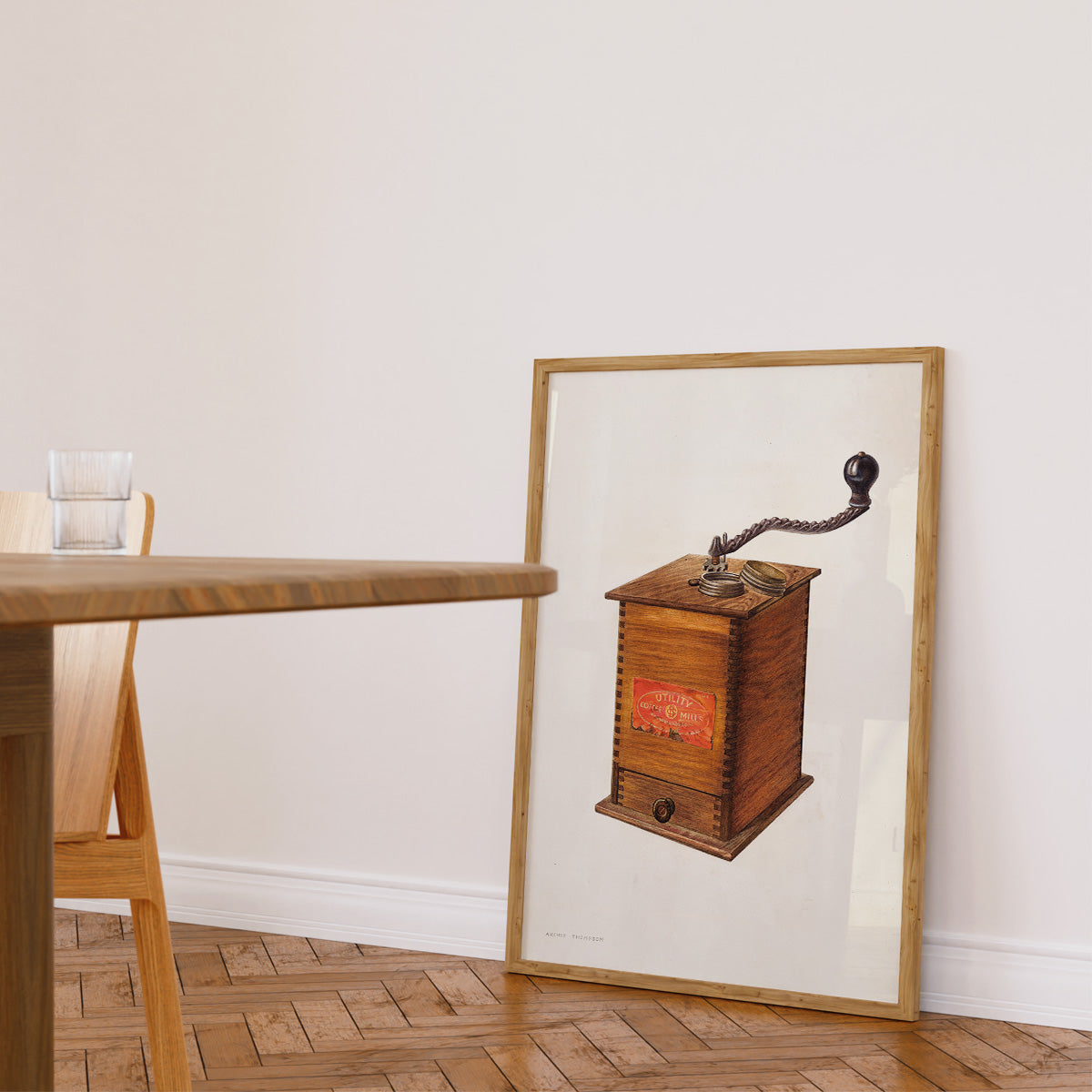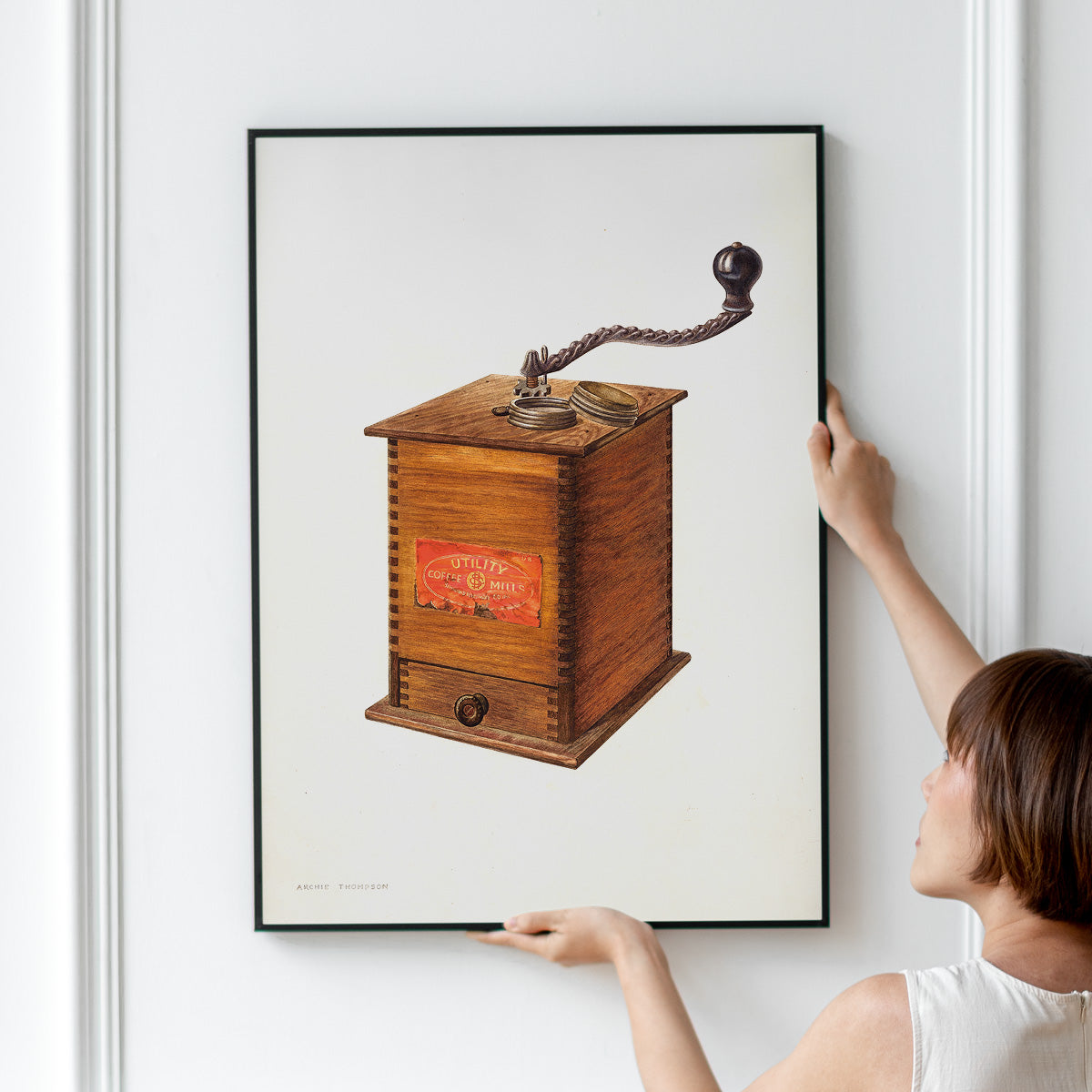 Stemningsfuld illustration af en klassisk kaffekværn i træ, malet omkring 1940 af Archie Thompson. Motivet er digitalt restaureret fra originalen, der stammer fra The National Gallery of Art, og gengiver med varme farver og fine penselstrøg den tidstypiske håndværksæstetik.