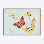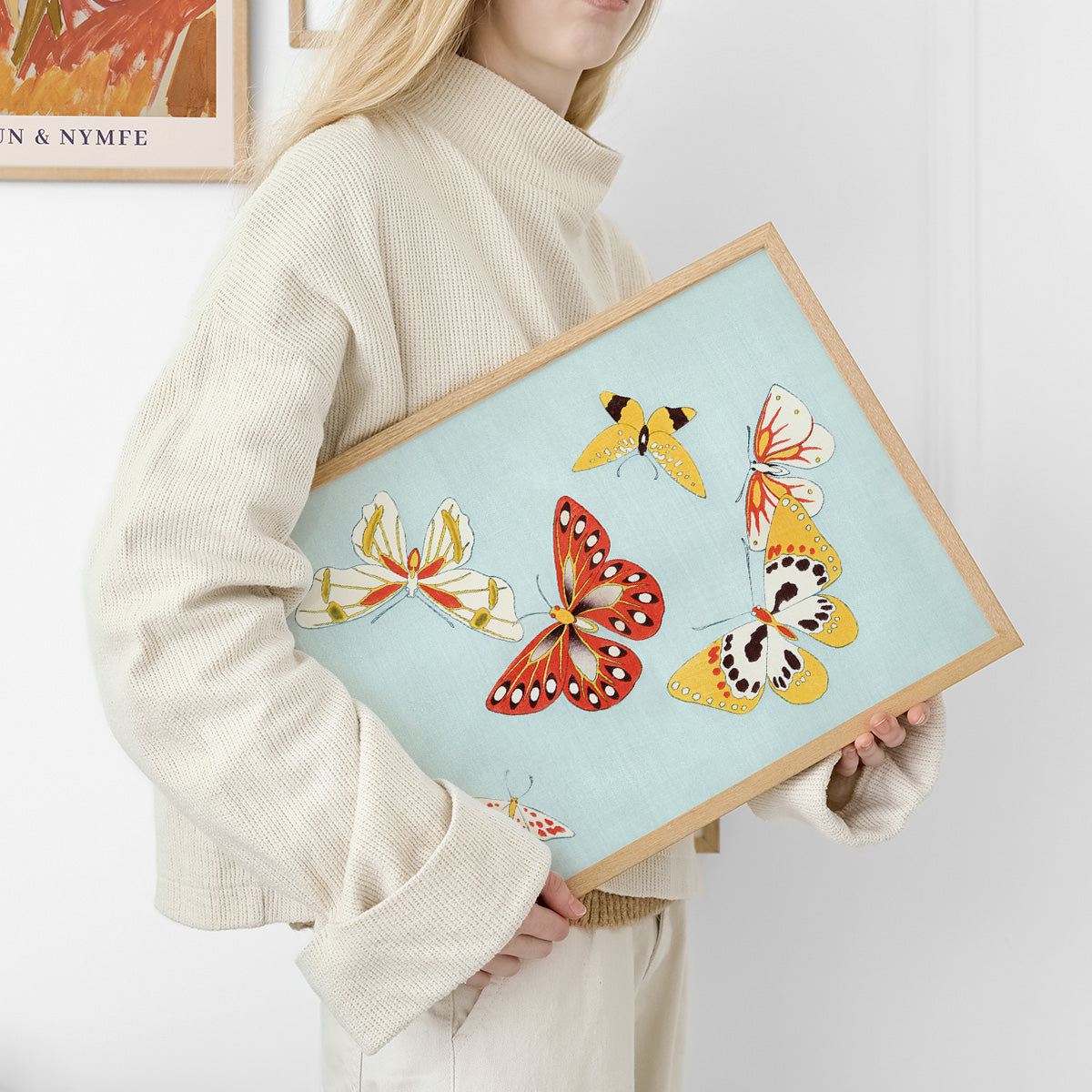 De farverige sommerfugle danser elegant over den lyseblå baggrund og bringer både ro og energi til rummet. Et æstetisk valg til stue, soveværelse eller entré.