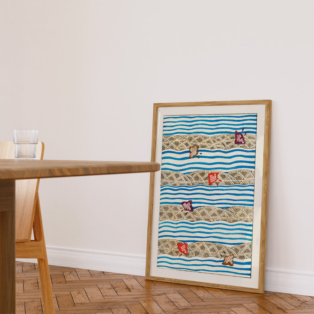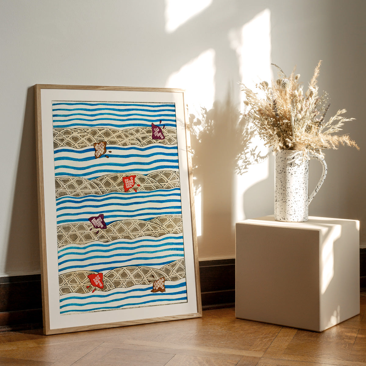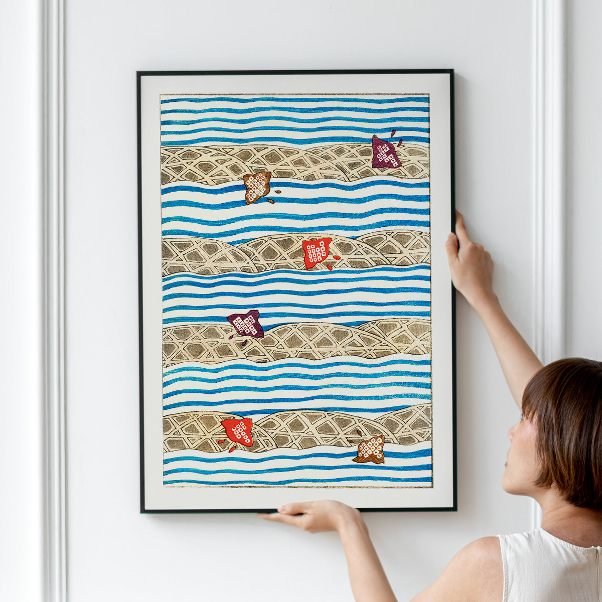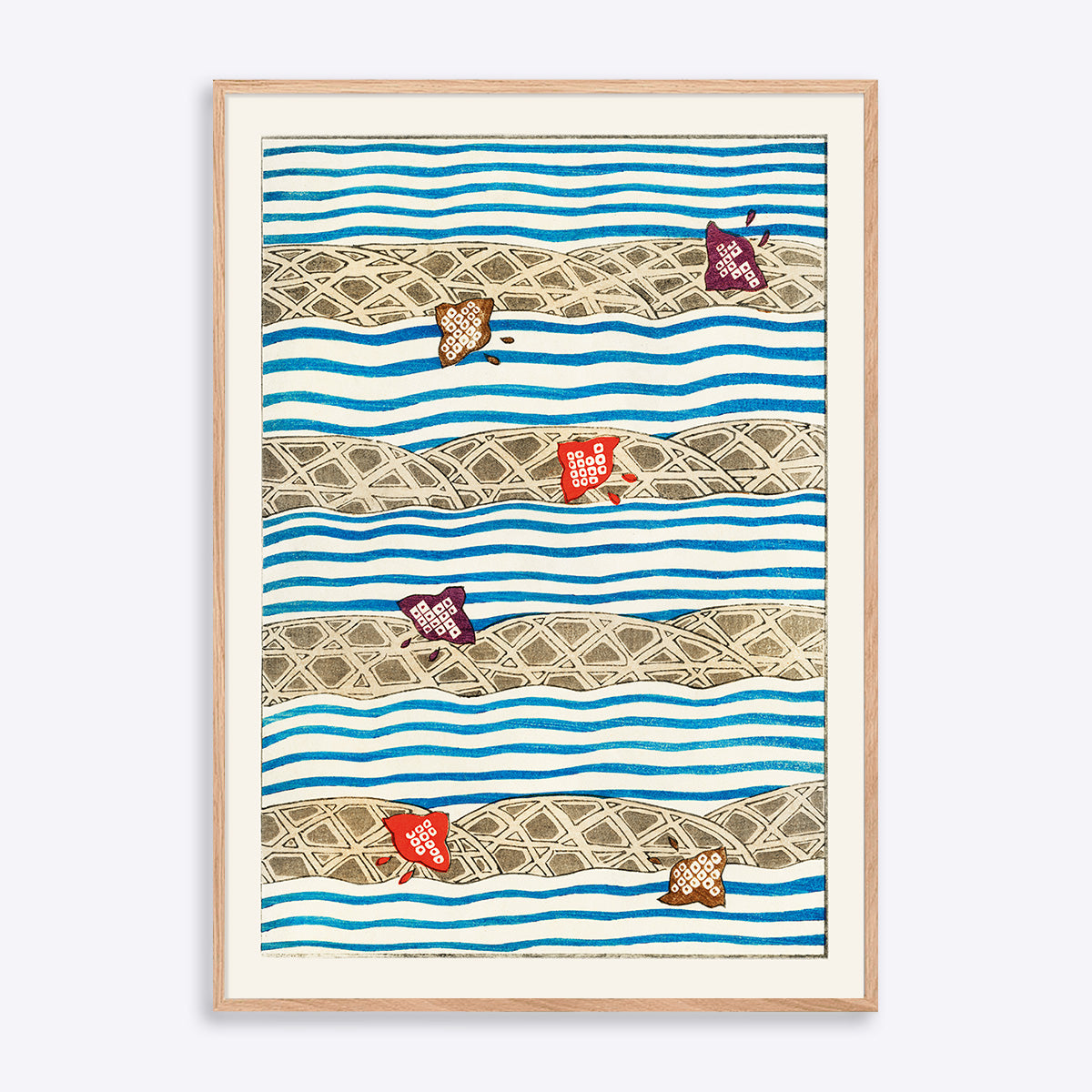 Shin Bijutsukai Flow: Et smukt træsnit design fra det japanske kunstmagasin Shin Bijutsukai, der blev udgivet i begyndelsen af 1900-tallet. Plakaten kombinerer traditionel japansk æstetik med en næsten moderne sans for komposition og farve. Perfekt til dig, der ønsker et kunstnerisk og sofistikeret udtryk på væggen.