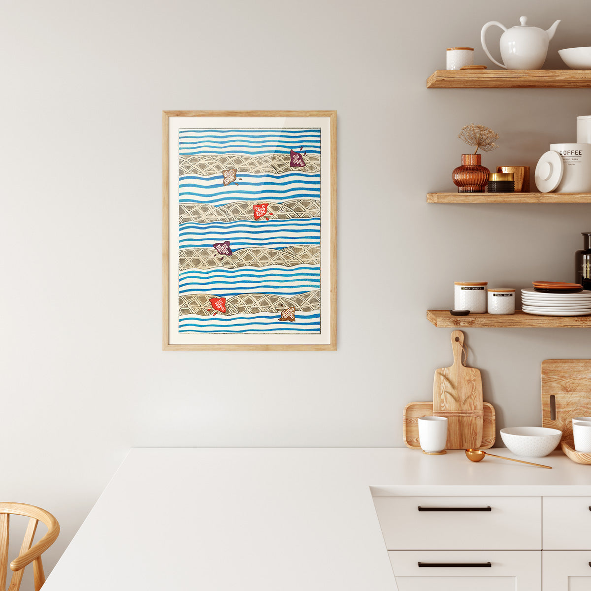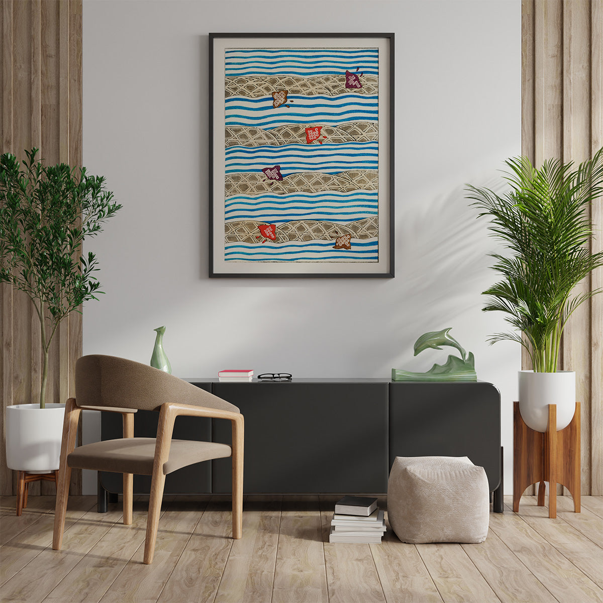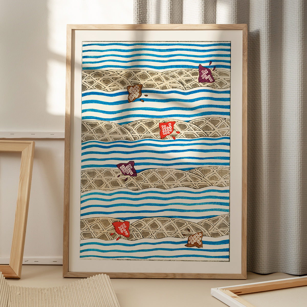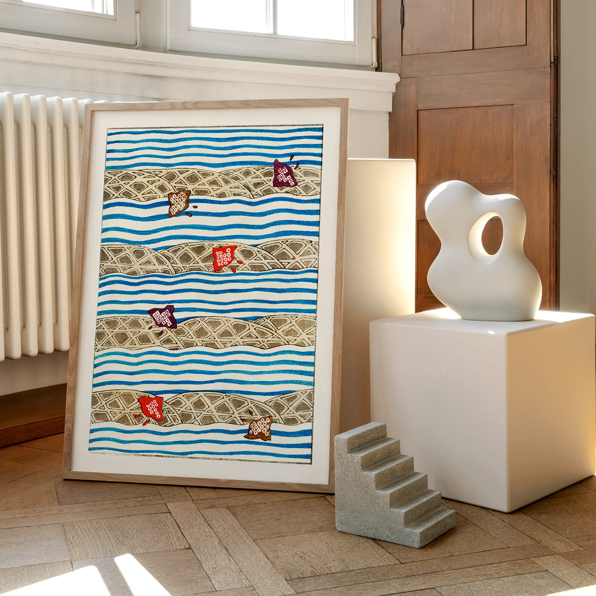 Shin Bijutsukai Flow: Et smukt træsnit design fra det japanske kunstmagasin Shin Bijutsukai, der blev udgivet i begyndelsen af 1900-tallet. Plakaten kombinerer traditionel japansk æstetik med en næsten moderne sans for komposition og farve. Perfekt til dig, der ønsker et kunstnerisk og sofistikeret udtryk på væggen.