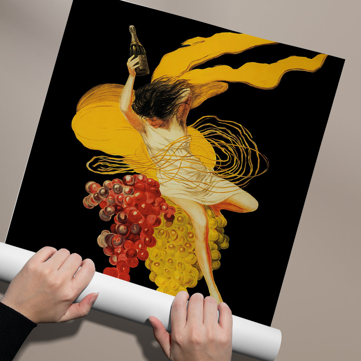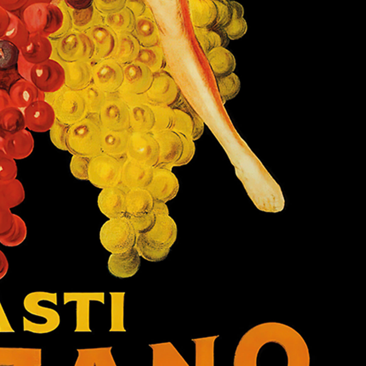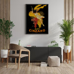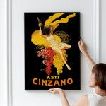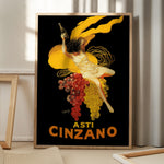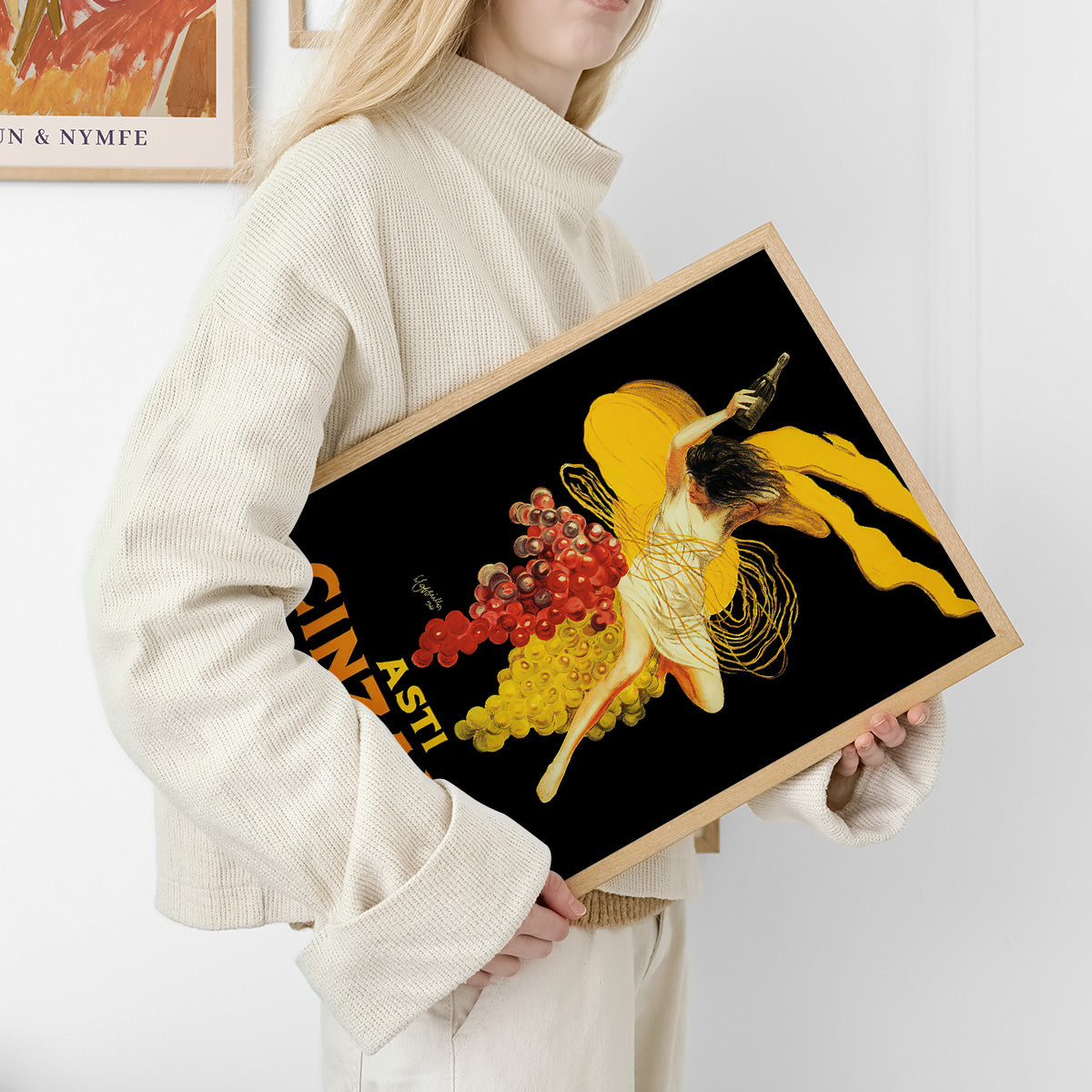 En sand eksplosion af farver og fest! Denne legendariske plakat fra 1910 er skabt af Leonetto Cappiello og viser en kvinde svævende over et bjerg af vindruer, med håret og båndene blafrende og en flaske Cinzano løftet i triumf.